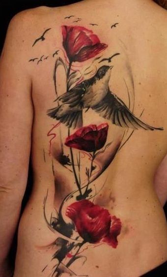 Red poppies and black birds as back tattoo. Flowers are red with black stems. Swallow have a white belly and black wings. Poppy flower is a very beautiful plant with big petals.