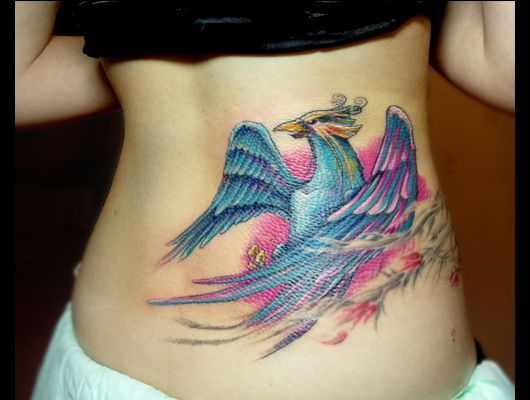Back tattoo with fantastic motive of bird in blue colours. The bird have gold feathers on the head. Blue wings with pink shades.