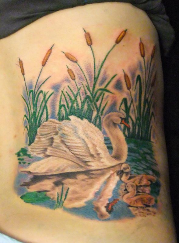 Tattoo with adult swan and two small birds. Swans are swimming on the water among plants.