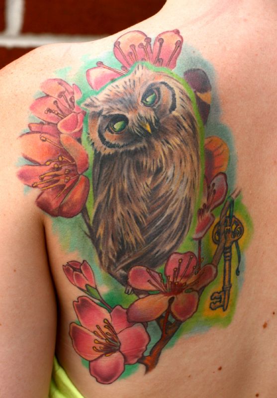 Tattoo with brown owl and pink flowers. The bird is sitting on branch where is gold key. Owl with green eyes.