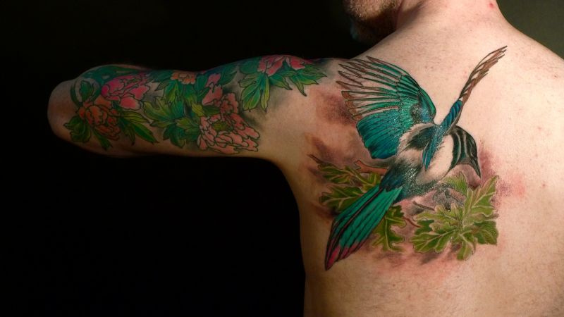 This is perfect body art. Tattoo with bird on the back ans next on the arm with flowers. Tattoo with magpie among leafs. The bird is green, brown, black and white. Design on arm is present colourful peonies and green leafs. Petals of peonies in pink and orange colours.