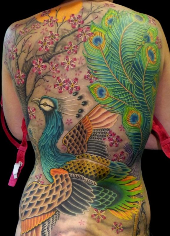 Awesome bird tattoo. The peacock design in various colours look amazing. Good job! Huge tattoos on the back, bird is so big with long tail in green and blue shades. Bird motive with floral elements. Tree of cherry blossom.