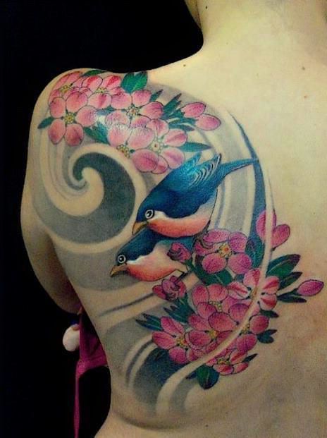 Tattoo on the left side of the back. There are two birds and pink flowers. Birds have dark wing and red-white belly. The flowers are small with a few petals.