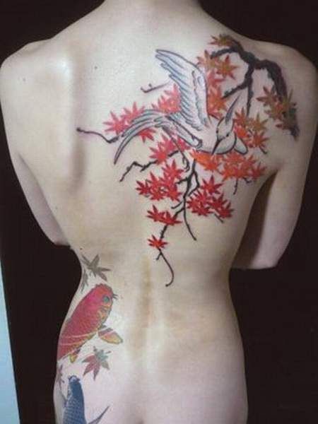 Back tattoo with tree and bird. The bird have white plumage. Tree with orange and red leafes. Below it are two fishes. One fish is red, second is black.