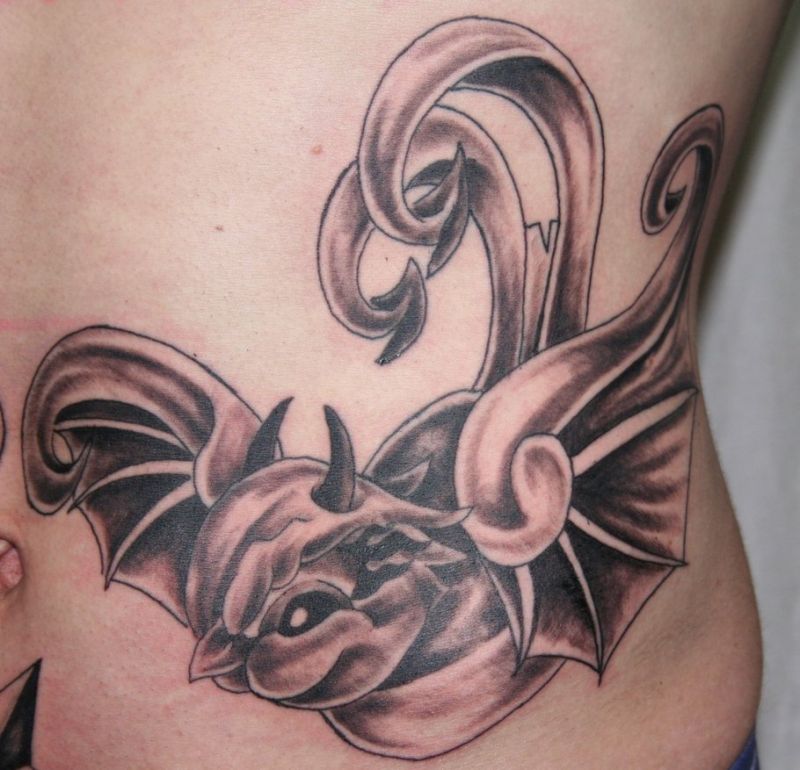 Nice idea on bird tattoo. Swallow as devil bird. On the head bird has short horns and a tail finished with arrows. Wings look like wings of the bat.