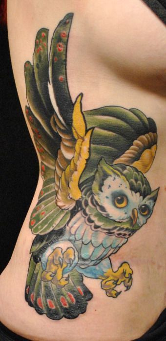 Big project with bird, it's an owl tattoo on the part of belly. Wings are black and yellow, belly of bird is blue.