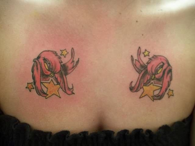 Two sweet birds with yellow stars. Chest tattoo with two birds, both look the same. They are pink with yellow nibs and eyes. On the wings they are keeping a yellow stars. Two smaller stars above the birds.