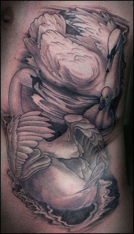 Two big swans and one small. Probably there are parents with baby. Bird look awesome, they have white colours. Swans are swimming on the lake.