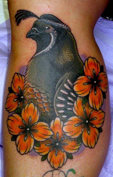 One of the ideas with calf tattoos. It's a dove among the flowers. Bird is black, the flowers in orange colours.