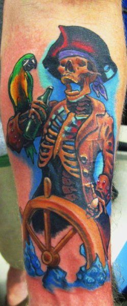 Colourful tattoo with parrot and skeleton. Skeleton of the pirate with the parrot on the shoulder. The bird in colours green-yellow.