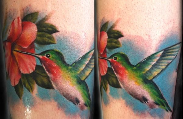 Tattoo with bird and flower. The hummingbird is green, white and orange, flower is red. The background of the tattoo is light blue. It look very nice on calf.