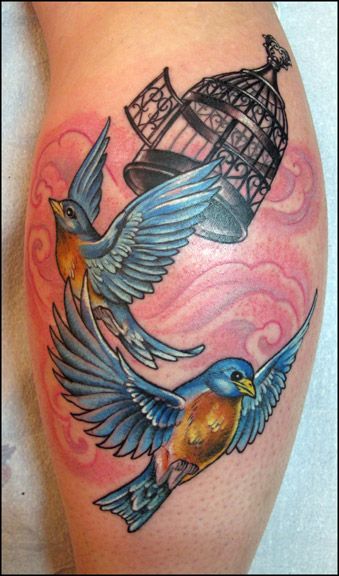 Beautiful bird tattoo in colours. Two birds in flight and black birdcage. Birdcage is open. Birds are blue with yellow feathers on the belly. The background is pink.