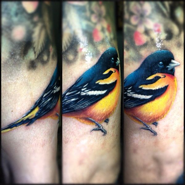 Chickadee tattoo. Great bird in amazing colours. Bird with dark plumage and yellow belly. The birdie is looking out realistically, the tattoo sensational is made.