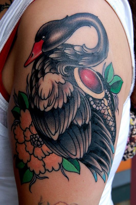 Tattoo with bird, swan motive and flower elements. Black swam with red nib and red broach on the wings. Below the swan is orange peony with green leafes.
