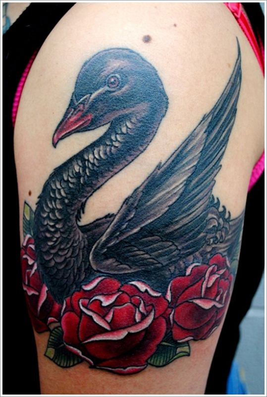 Tattoo with black swan. Bird look so nice. Below are red roses. Three flowers with leafs.