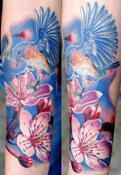 Nice tattoo in blue and pink colours. The bird with blue wings and light plumage on the belly. Cherry blossom are pink. It's fantastic tattoo on arm.