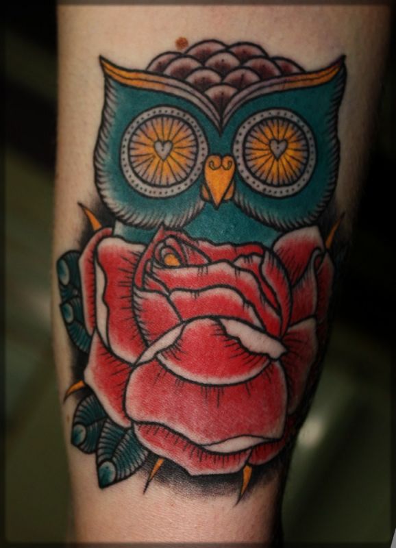 Tattoo in colours with bird and flower. The owl is blue, yellow and brown. Flower is red, it'a a rose.