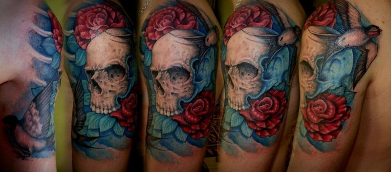 Awesome tattoo on arm. White skull, red flowers and two birds. Two red roses with blue leafs among the skull. On tattoo are two swallows.