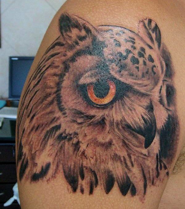 One of the tattoo on arm. Photo present tatto with owl. It's a head of brown owl with orange eyes. This bird is so beautiful.