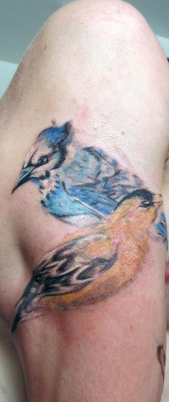 Tattoo with two birds. One of them is blue, second is orange and black. Tattoo on right arm.