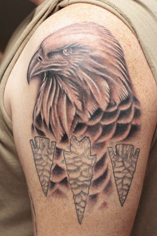 Tattoo with eagle head. The head with smal nib. Dark plumage look awesome. Tattoo on the left arm.