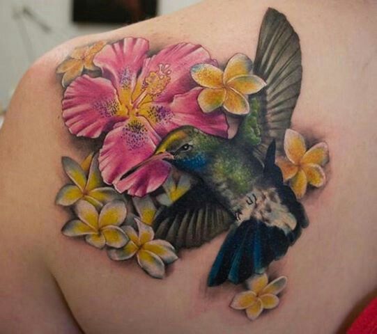 Pink hibiscus and yellow plumerias ith bird. Great project of tattoo.