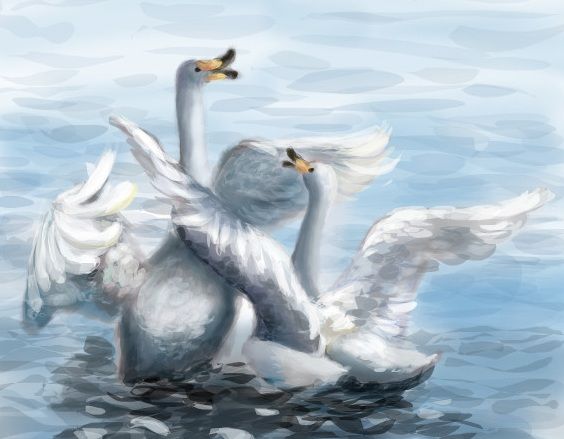 Tattoo design with two birds. Swans are white. They look very happy. As backround is blue water.